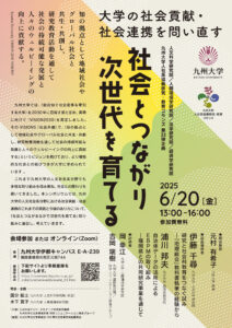 これまで九州大学の人文社会系分野でも、多様な取り組みを積み重ね、社会との関わりを築いてきました。本シンポジウムでは、九州大学の人文社会系分野における社会貢献・社会連携のこれまでの実践と今後のあり方について、「社会とつながるなかで次世代を育てる」取り組みに着目し、考えていきます。