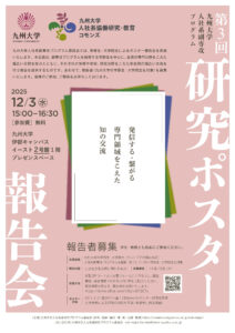 九州大学人社系副専攻プログラム委員会では、12月3日(水)に、学部生・大学院生によるポスター報告会を実施いたします。